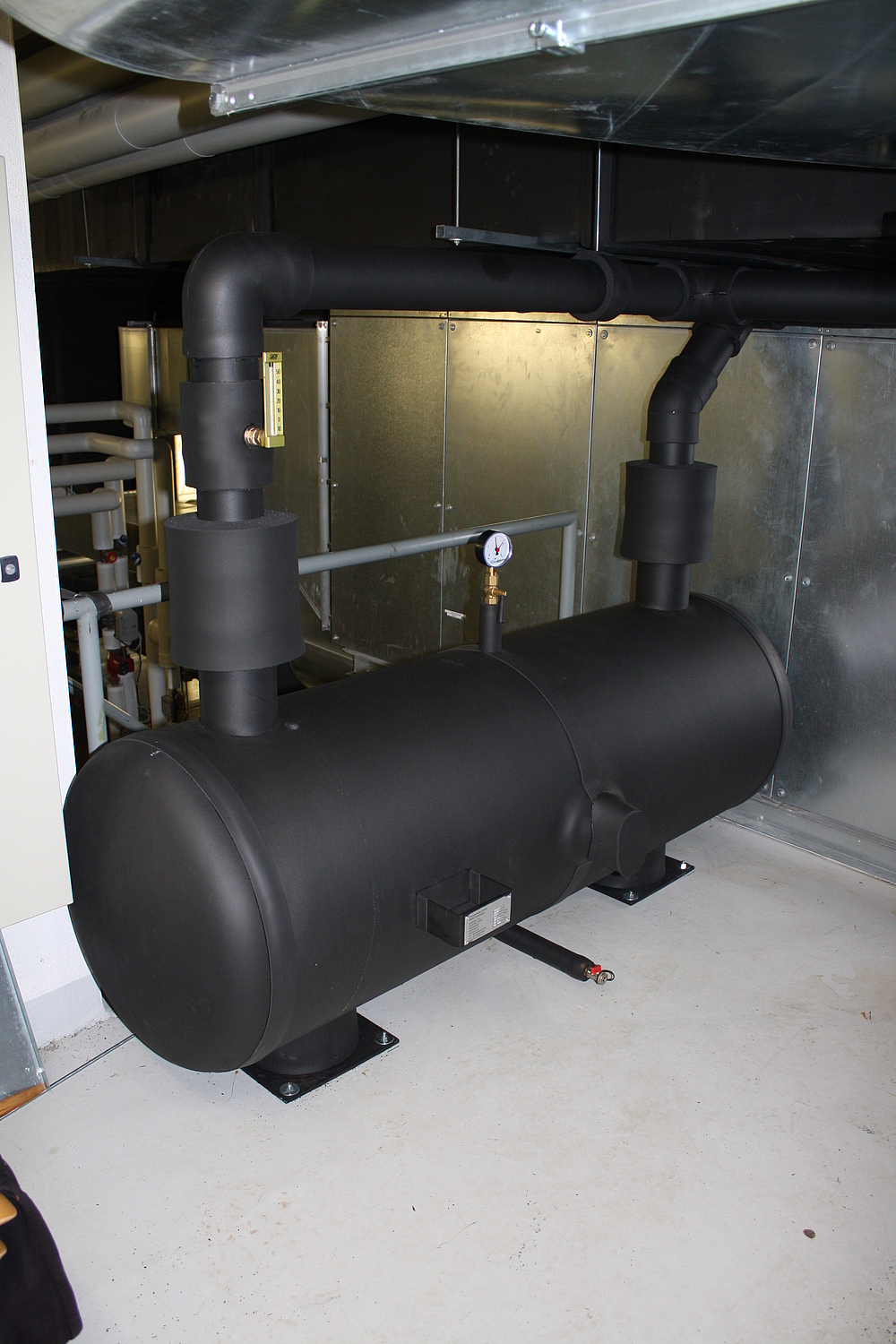 Ein Pufferspeicher verringert die Startvörgänge der Kältemaschinen und erhöht damit die Effizienz. Die Spezialanfertigung wurde passgenau gefertigt und durch unsere eigenen Mitarbeiter sauber isoliert.