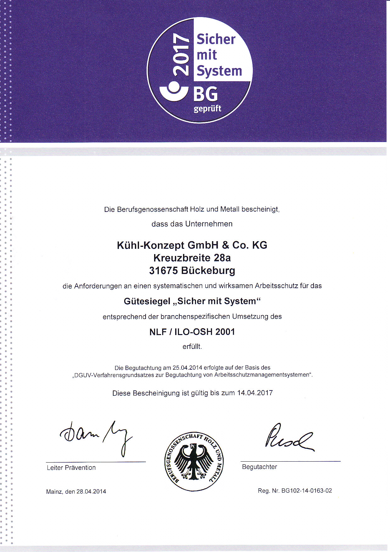 Am 02.05.2014 wurde unserem Unternehmen nach umfangreicher Prüfung erneut mit dem Gütesiegel "Sicher mit System" zertifiziert.