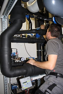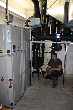 Problematisch war die Einbringung und Aufstellung der Anlage in der vorhandenen Lüftungszentrale. Der Kaltwassererzeuger musste durch die Kammer eines vorhandenes Lüftungserätes eingebracht werden.