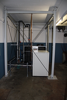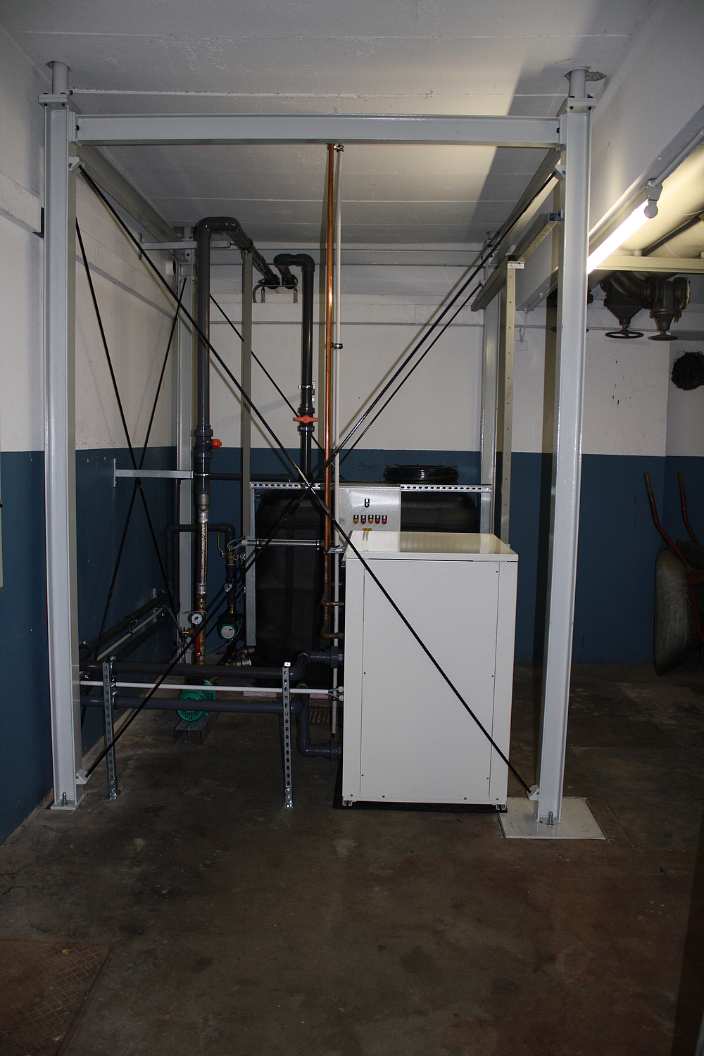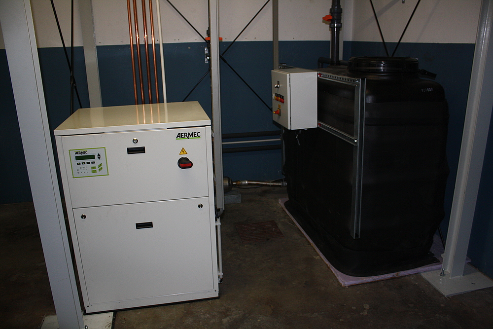 Im Maschinenraum steht zusätzlich noch der Pufferspeicher mit Pumpenbaugruppe.