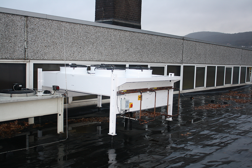 Auf dem Dach über dem Aufstellungsraum wurde eine hocheffizienter, luftgekühlter Verflüssiger installiert.